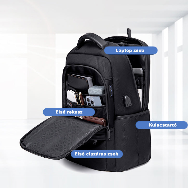 Az elülső, kisebb fő rekesz szervező funkciót lát el: itt három belső zseb és két tolltartó segíti a rendezett pakolást, így telefon, töltők, jegyzetek és egyéb apróságok mindig kéznél vannak.