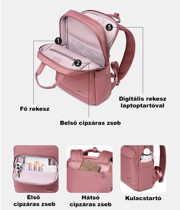 Plusz egy első külső cipzáras zseb – gyorselérésű rendszerező panel