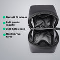 A fő rekesz 180°-ban nyitható, így teljes betekintést nyújt a tartalomra. Az elválasztó középső részében kártyatartó zseb található, mindkét oldalán 3–3 gumis rögzítő, melyek ideálisak kábelekhez, adapterekhez vagy kisebb elektronikai eszközökhöz. A két hálós zseb további lehetőséget kínál az apróbb tárgyak biztonságos tárolására.