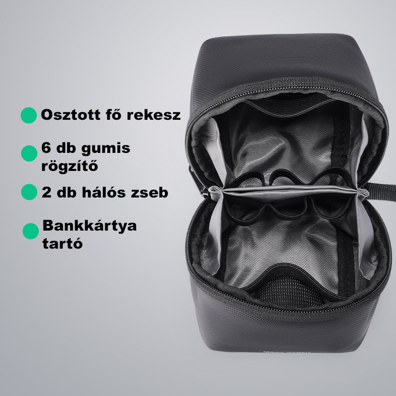 Kettéosztott főrekesz – középen kártyatartó zseb, két oldalon 3–3 gumis rögzítő kábeleknek, töltőknek.